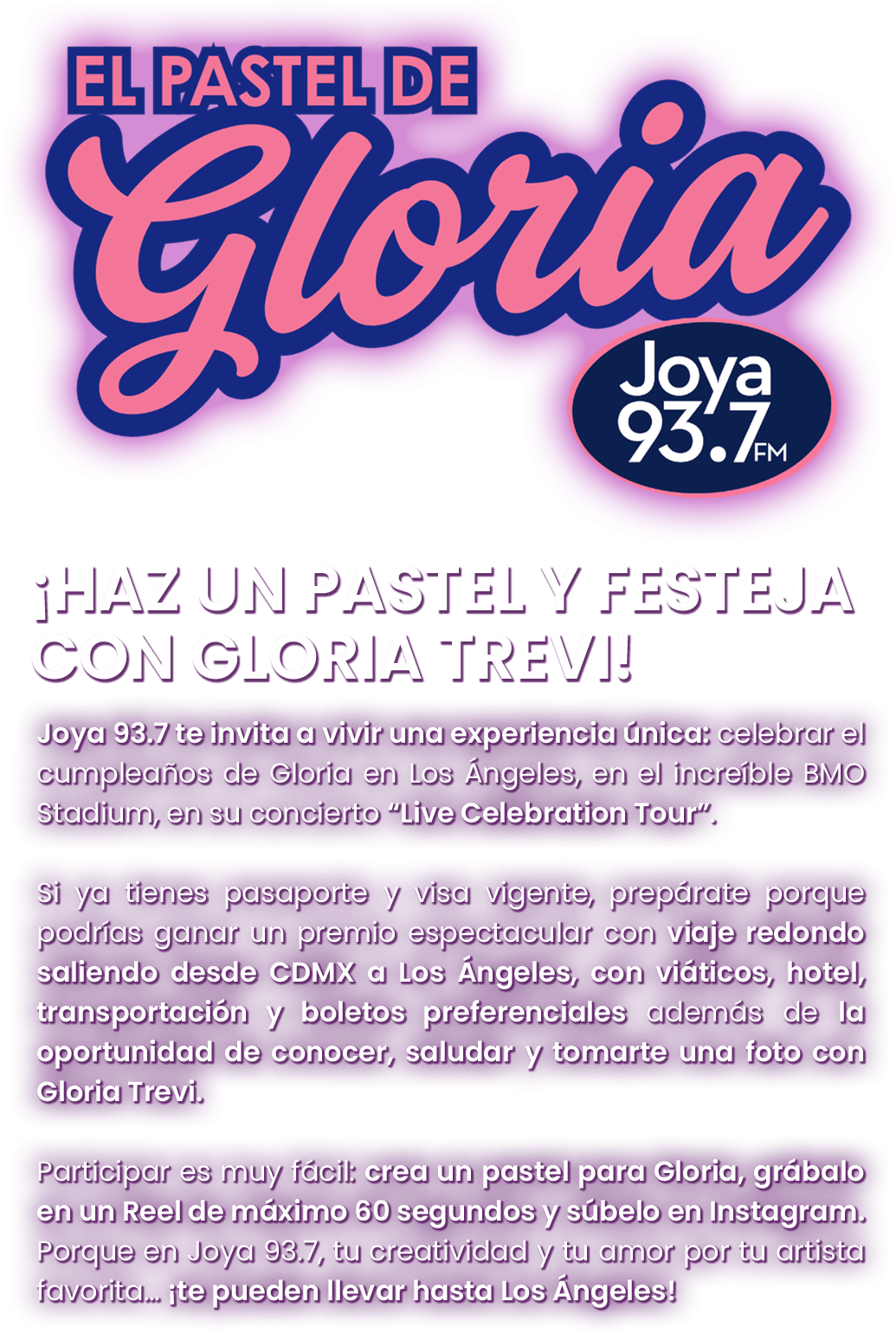 Participar es muy fácil: crea un pastel para Gloria, grábalo en un Reel de máximo 60 segundos y súbelo en Instagram. Porque en Joya 93.7, tu creatividad y tu amor por tu artista favorita… ¡te pueden llevar hasta Los Ángeles!